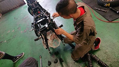202007/27 ツーリングだったのに。。。。 メンテナンス・大将商会 0 7月26日(日) 本来ツーリングだったのに・・・・ 雨の予報。。。 行先の高知も雨。。。。 中止にしないと仕方ない・・・。 時間空いたので、本日も直幸に付き合う事に! スイングアームを取り換え、私が仕上げていたKONI(76P-1343)を装着! スイングアームのブッシュ抜くのに苦労しました。。。。 直幸嬉しそうに付けてるわ。。。。 リア周りも一生懸命磨きなさいよ!! 私は、フロント周り仕上げていきます! まずが、キャリパー左右のOH! 装着です! 少しづつですが、形になっていっています! [16回]