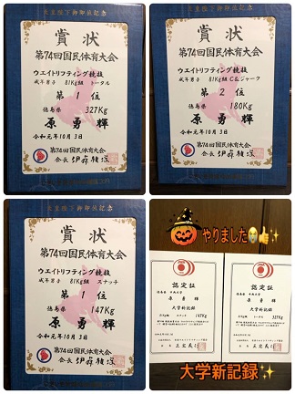 201910/07 2019国体in茨城 少将本番 私生活 0 10月3日(木) 上野駅に朝7時前に行き7時の特急に乗り茨城県高萩市へ! 少将やりました!! スナッチ競技優勝!! C&J2位!! トータルでも優勝です!! 気持ちよく、徳島に帰れます!! もぉー時間無いので帰ります!! 明日の新聞が楽しみだ!! お疲れ様! 少将!! [15回]PR