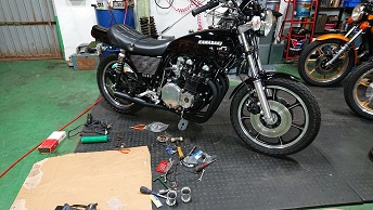 202104/22 朝一スタート! メンテナンス・大将商会 0 4月18日(日) 朝一より塗装スタート! 塗装完了後、Z1000LTDを見に来ていただいた、岡山県のTさんと打ち合わせし、無事、嫁ぐことになりました! 午後より、塗装が乾き取り付け! 近所の助手(笑)西〇君の手磨き作業!! 嫁ぐことになったZ1000LTD!! ちょっと気になる点を再チェックし、改善しておきます! ホボホボこれで大丈夫でしょ!! なんだか、1台減ると寂しくなるでしょうね。。。。。 しかし、本日は遊びに来た人多くて疲れた。。。。。 [14回]