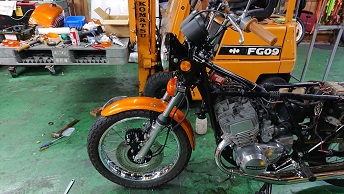 202012/14 750ss フロント回り完成! メンテナンス・大将商会 0 12月11日(金) 今日は、一気にフロント回り仕上げていきます! まずは、配線を整え・・・・ お決まりのM社長に見守られながら・・・・ ライトOK! ニュートラルランプOK! ウィンカーOK! メーター点灯OK! 本当は、配線チューブをやり替えたときにカプラーの配線の差し込みを間違えてて、少し悩みましたが、無事電気系はクリア! 社外のライトステーより、純正ライトステーにウィンカーステーがイイですね! ミラーも必死に磨き輝きを戻し装着です! ブレーキパーツの1点がまだ手元にないのでブレーキは後日に。。。。 明日は、癒しの土曜日ですが、、、、 明日は、リア回りやっていくことにします! [14回]