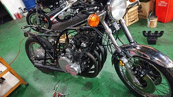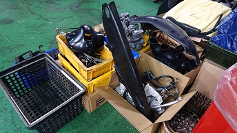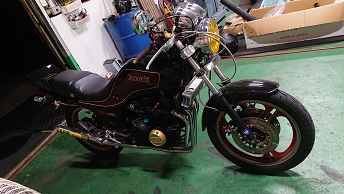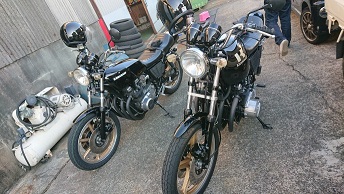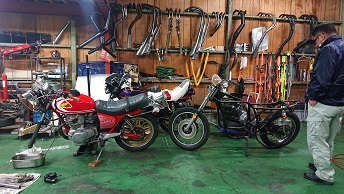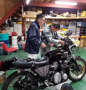 202010/19 ちょっと…フラフラ。。。 メンテナンス・大将商会 0 10月18日(日) 夜遅かったけど・・・・起きれてよかった! 朝8時にガレージを出発し、香川県豊浜へ! 愛媛の知り合いのM本さん・メンバーまぁー君と待ち合わせ、ちょっと見学に! 残念ながら縁が無かったという事で。。。。 でも、良かったですね!M本さん!! この後、ガレージに帰ってきたが・・・・・ やはり歳のせいか身体が・・・・・・ 夕方3時まで休憩し、それより作業開始です! ガレージに来ると同時に、待ち構えていたようにドンドンやってくる。。。。。 副長とM社長!! S内は、GSX400Fのマフラーの確認・・・ が、私は私の作業進めます!!(笑) マフラーの色剥ぎ作業。。。。 H2用のタロッティー管!! 3本あるので、陽のあるうちに済ませたい。。。。 どうにか、3本色剥き完了!! すると、またまた同級生が、昔乗っていたGPZ400Fを購入し、見せに来たよ! 400ブームか???? やっぱり身体が・・・・さぁー今日は帰ります。。。。 [17回]