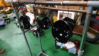 202007/30 取付! メンテナンス・大将商会 0 7月29日(水) 雨上がりの次の日は・・・・ ガレージ内も、ムンムン。。。 空気の入れ替えをして、作業進めます。 まずは、Z1のボトムケースの磨き~ ですが、夢中になり、画像無し(笑) 続いて、昨日塗装したパーツ取付けていきます。 リアフェンダーもイイ感じになりました! ハンドル周りも~ ライトケースも塗装したので、綺麗になりました! 今のところ、これぐらいで取付けるものは終わりかな。。 そろそろエンジン組み立てに進まないと・・・腰下だけ! 腰上は、まだ内燃機屋から帰ってきていないので! ・・・・明日は、シャリーのエンジン組み立てるとするか。。。。 [16回]