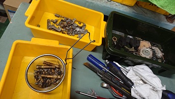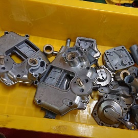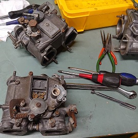 202003/16 出張作業! メンテナンス・大将商会 0 3月14日(土) 本日、午後より、ヨンメリのマフラー修理の出張に来てくれるため、午前中は、キャブに取り掛かります。 見てください・・・・なかなか手強そうなやつでしょ。。。。 まずは、分解に始まり、再メッキするパーツブラストあてます!! 小さなパーツありすぎで手間かかりますわ。。。。 お昼ご飯は珍しくM社長が差し入れしてくれましたが・・・画像無しです(笑) 昼過ぎに出張きてくれたので、マフラー補修の方法を説明し、作業開始です! 底に、2か所シッカリ吊り込む仕様です!」 ついでに、GTRのタコ足の補修もしてもらいました! この後、マフラーの高さを調整し、オイル交換もやっておきました! 前から見ると、マフラーの下がりは無くほぼ、エンジンメンバーとフラ ットになりました!!! この後は、地道にキャブの作業進めます! 「魔法の液」に漬け込み、ボディーを頑張って磨き・・・ 汚れの酷いパーツには、軽くブラストを掛け・・・・ 気が付けば、日が変わってる。。。。 続きは、明日の朝からにします! [12回]