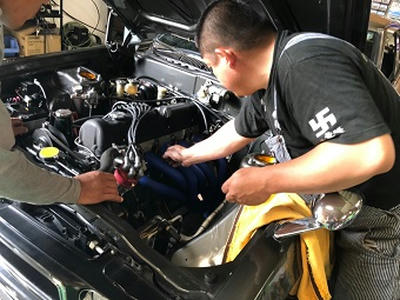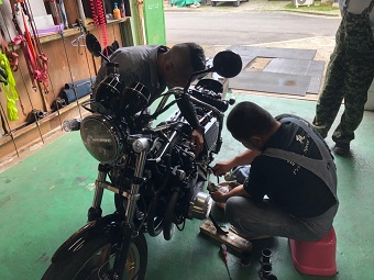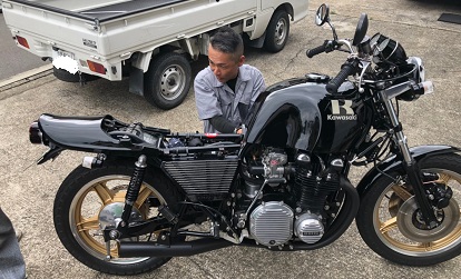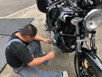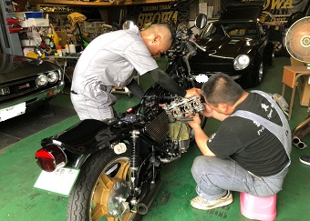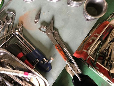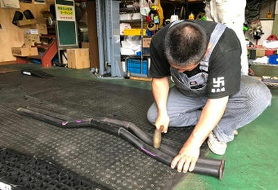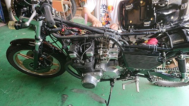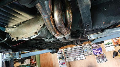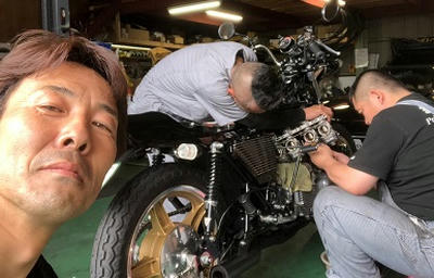 201907/16 朝からタコ足交換! SHOWA 0 7月15日(月祝) 海の日!なのに夏っぽくない季節・・・・。 まだ、作業しやすいかも! 朝から、香川より、ケンケン&マー君がやってきた! ケンケンのブタケツのタコ足交換です。 現在、ステンレスのタコ足が装着されているけど、メガネフランジ部分が低すぎて、マフラーと地面とのクリアランスが少なすぎてる。。。。 今回、新品のトラストのタコ足を装着します。 たかがタコ足ですが、作業は非常に面倒臭い。。。。 工具がなかなか使えず、作業効率が悪い。。。。 取付も非常につらい・・・・ こんな時、自分の腕の太さが嫌になるわ。。。 タコ足が変われば、フランジから後ろのマフラーのクリアランスも変わるので叩いて調整します。 何度か、この作業を繰り返し、最終少しパイプを潰したい部分があったのでペンチで挟むと・・・ ペンチが折れた。。。。 こんなん折れるか? 前に、ラジペンや、ニッパーは折ったことがあったけど・・・・ 握力・・・・両手だから、170以上はかかったかな?(笑) 作業もうまくいき、マフラーの位置もイイ位置に張り付いた。 ヤレヤレ作業終了! 昼食でも行こうかとしたときに、魔が悪く表れた副長・・・・。 キャブの調整が。。。 また面倒なこと言ってきて。。。。。 腹減ってるときに・・・・・ 調整を何度か繰り返し、良い状態に近づいたところで、後は副長自身がするとのこと…。 なんじゃい!!!! なので、3人は本日昼食抜き。。。。 疲れた一日でした。 [12回]PR